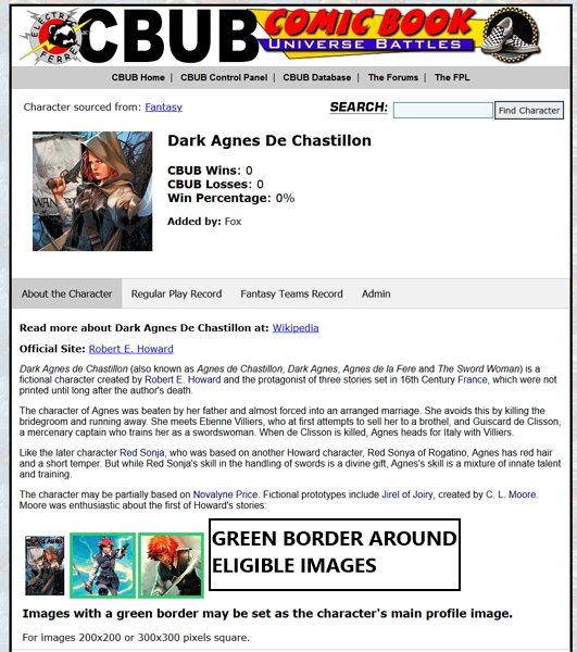 Fox Posted November 7, 2020 Author Read Aloud Posted November 7, 2020 I have provided the following functionality to all users: 1. You may upload a new image for a character into the forum gallery and then put it on the character's CBUB Profile sheet This works just like when adding a new character. Upload the image into the Forum Gallery and then use the utility on the character's CBUB Profile to add it there. If you want, you can create your own Forum Gallery album for images. Or keep using the one people generally use. It really doesn't matter. 2. You may switch out the character's main Profile Image used in matches There's a lot of real shit legacy images that are the main profile image of character's used in matches. Now you can switch them out. It must be a 300x300 pixel image OR a 200x200 pixel image. If eligible, they will be surrounded by a green border on the character's profile sheet. Feel free to play around with this profile so you get the idea. Addendum: Obviously, do not upload inappropriate images or material. 1