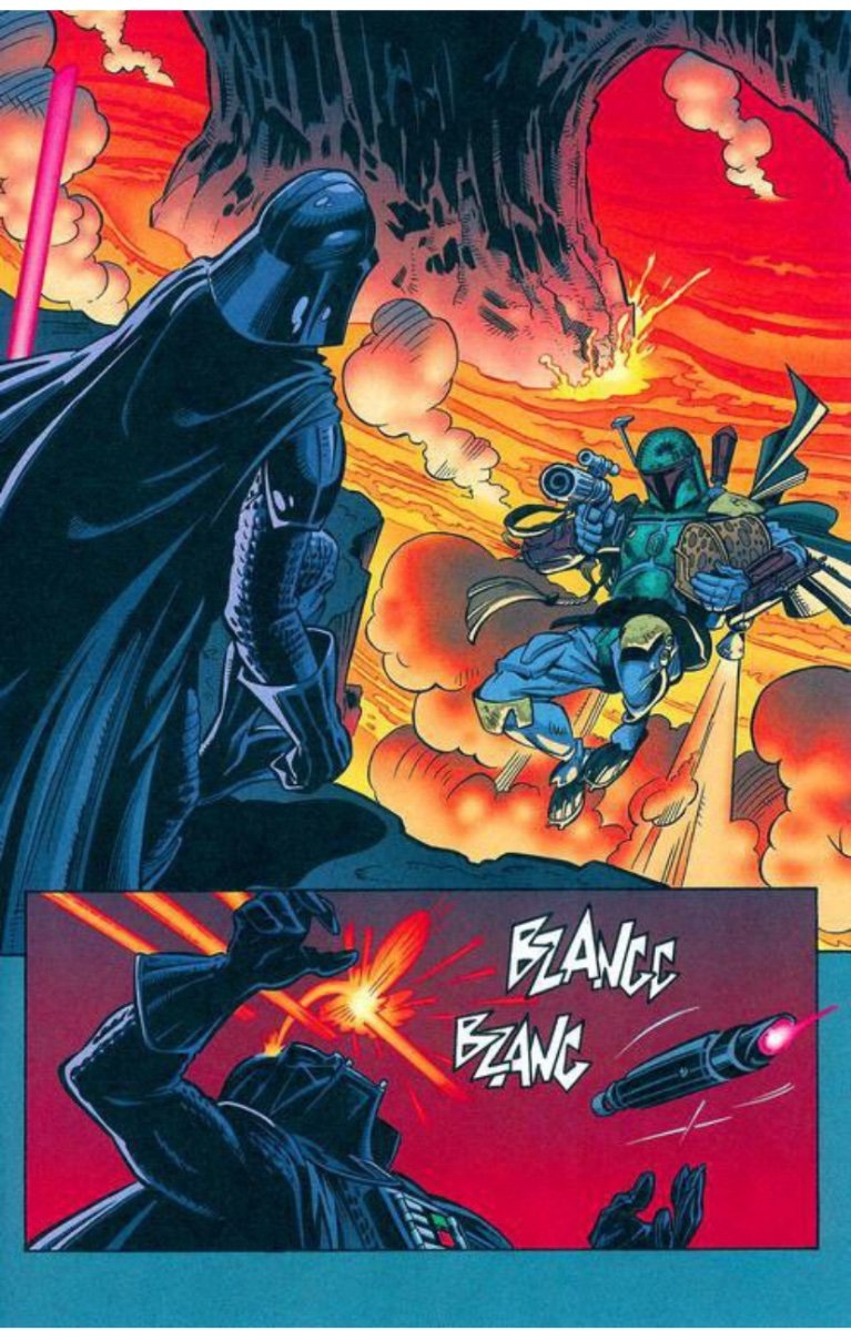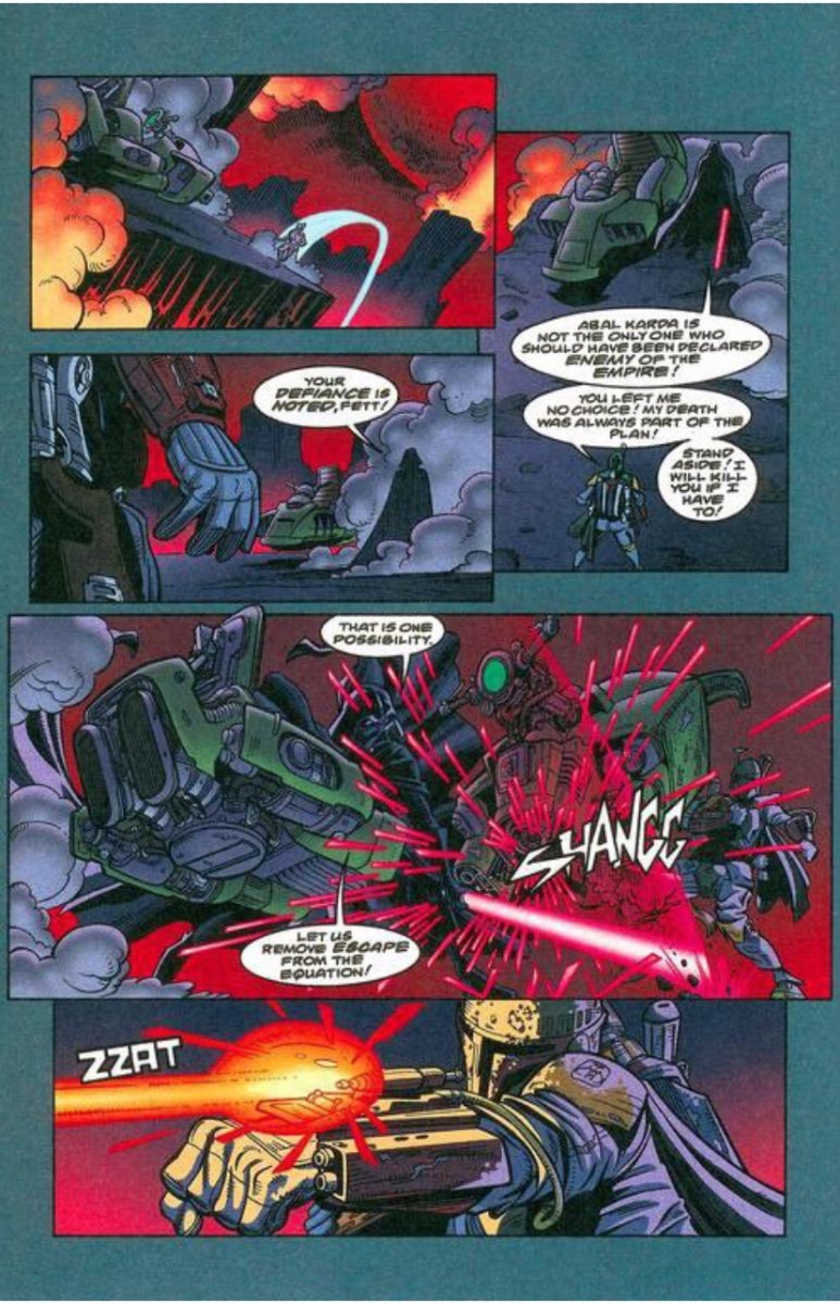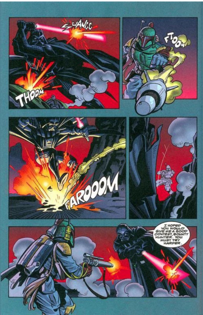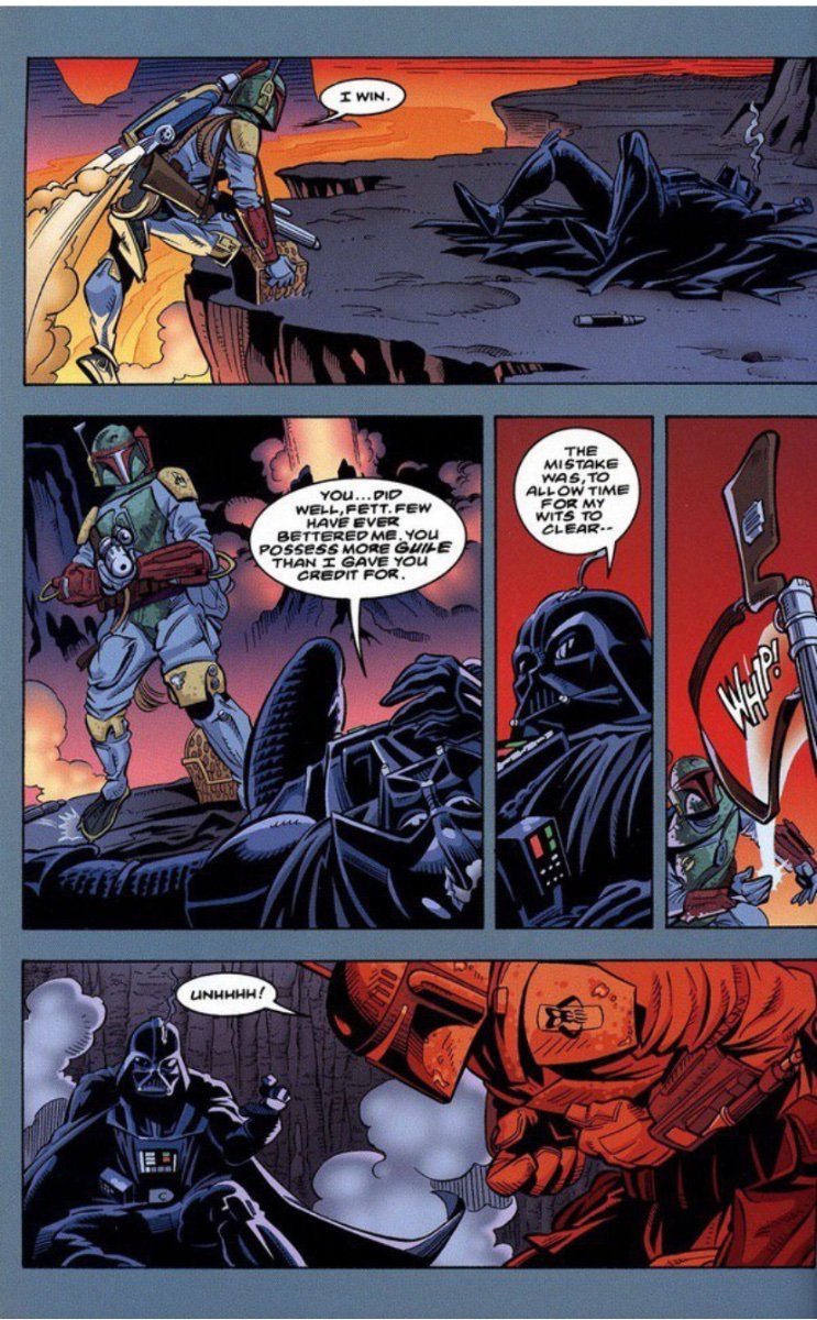Pizzaguy2995 Posted January 24, 2024 Read Aloud Posted January 24, 2024 11 hours ago, RakaiThwei said: Specifically the feat of Boba holding his own against Vader. A LOT of Boba stans often cite this but many power scalers and debunkers on YouTube often point out in both Legends and Canon that Vader is just playing with Boba and never took him seriously. This confrontation happened in the SW Legends comic series Boba Fett: Enemy of the Empire. Four years prior to New Hope, Boba had been hired to retrieve an important casket for the Empire only for them to try to double cross him upon Fett getting it. After killing the first 3 assassins sent after him, Vader himself confronted Boba Fett on Maryx Minor leading to the above fight. By the end both Boba and Vader himself admitted Boba had won, with Boba only hesitating to kill Vader cause he knew that the Empire would never stop hunting him if he personally killed Vader. Then Vader caught his breath and grabbed Fett in a force choke, though Boba managed to escape via knocking the casket over the cliff and forcing Vader to focus on retrieving it. (Sorry the CBUB font didn’t allow more than five pictures). But again for emphasize, both Boba and Vader out right said that Fett won that battle fairly.